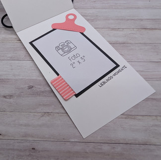 Wie im Schnittplan angegeben, auf die Innenseite kleben. Die Klammer und das Fähnchen/ Bordüre ausstanzen und an der Mattung anbringen. Die Klammer wird nur an den äußeren Rändern geklebt. So kann der Fotoplatzhalter oder das Foto im Nachgang noch drunter geschoben werden.