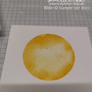Mit dem großen runden Stempel aus dem Set WATERCOLOR SHAPES wird eine "Sonne" in der Farbe OSTERGLOCKE auf meinen Kartenaufleger gesetzt.